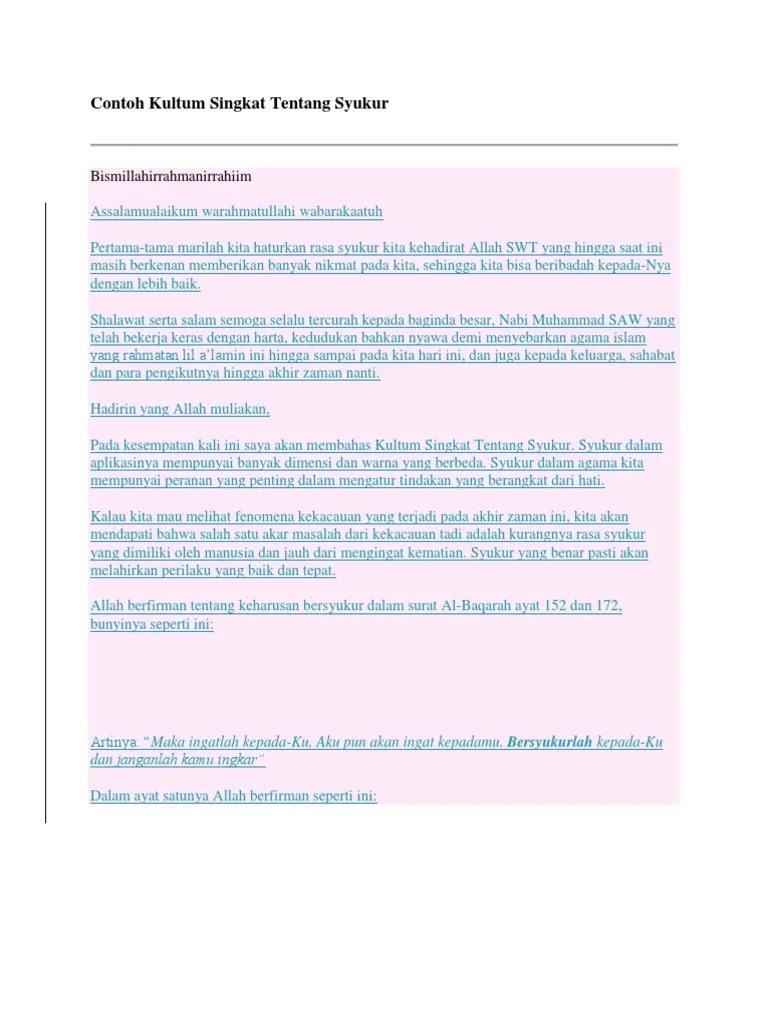 Sayidina muhammadin, waala alihi wasohbih ceramah singkat tentang sedekah dapat menyempurnakan zakat. Secara keseluruhan ceramah, khotbah dan sambutan merupakan salah satu bentuk dari pidato didepan umum. Khutbah jumat singkat dan pidato tentang kemerdekaan ini merupakan rekaman khutbah jum'at yang disampaikan oleh ustadz abu yahya badrusalam, lc. Dimana alloh adalah dzat yang senantiasa mengurus, memelihara, dan menjamin hidup kita sehingga dapat beraktifitas dan. Pertama dan yang paling utama kita harus pandai bersyukur kepada allah swt, karena atas pemberian umur panjang. Selawat serta salam selalu tercurahkan kepada junjungan nabi besar kita nabi muhammad saw, beserta keluarga, para sahabatnya. "dan (ingatlah juga), tatkala tuhanmu memaklumkan: Contoh kultum singkat tentang sabar syukur dan ikhlas ini akan kami paparkan dalam bentuk materi saja. Terkadang, ada sebagian muzakki yang menyerahkan zakatnya karena ada kepentingan pribadi. Maka dari itu selalulah bersyukur hanya kepada allah. Jujur itu sangat diperlukan dalam segala halmisalnya dalam menuntut ilmu diperlukan kejujurandalam bekerja pun diperlukan kejujuran apalagi dalam hal berbi. Teks pidato bahasa indonesia tentang syukur.