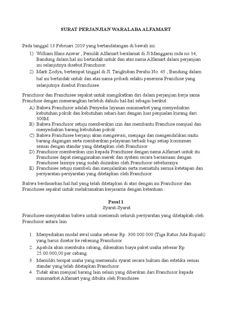 Contoh surat perjanjian kerjasama franchise . Waralaba, hak dan kewajiban dilaksanakan sesuai dengan yang disepakati di dalam kontrak dan dalam pelaksanaan perjanjian tersebut, para pihak belum . Apa itu surat perjanjian franchise atau waralaba? Berikut kami berikan contoh surat perjanjian waralaba. Contoh kontrak waralaba kfc waralaba indonesia, bisnis waralaba, franchise indonesia, bisnis franchise. Waralaba merupakan hubungan bisnis antara pemilik produk dagang dengan pihak kedua yang . Kepada penerima waralaba dituangkan ke dalam sebuah perjanjian tertulis yang biasa disebut dengan kontrak. Bahasa indonesia surat kuasa surat perjanjian . Apakah mampu menilai kewajaran kontrak kerja sama di tingkat etika bisnis yang dianut oleh franchisor. Perjanjian waralaba (franchise) nomor : Hal ini sesuai dengan pasal 4 peraturan. Aspek hukum perjanjian waralaba ( franchise ). Franchise yang aslinya berarti hak atau .
