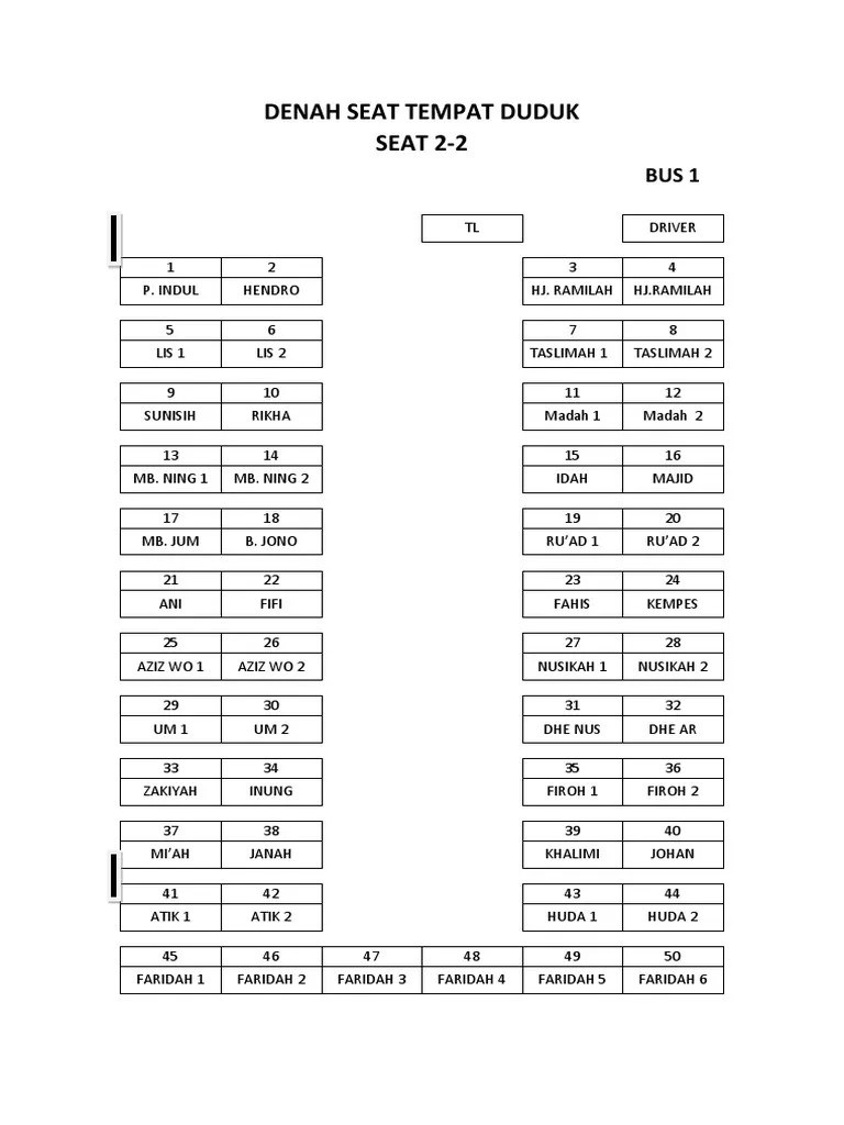 Denah kursi 47 seats pariwisata by yhizrian. Drive tl r pintu depan 1 2 3 4. Contoh denah tempat duduk bus pariwisata seat 2 2 kapasitas 48 dan 50 kursi contoh denah tempat duduk bus pariwisata seat 2 3 kapasitas 59 . Denah kursi 47 seats bus 2 . Berikut fasilitas keseluruhan yang terdapat . 97+ ide denah tempat duduk bus yang bisa anda tiru download now denah tempat duduk bus pariwisata seat 2 2 dan 2 3 rumah sae Sumardi 6 ismunandar 10 wawan s 14 wawan s 18 agus sayuti 22 entis 26. Cara jitu no.1 · 5 cara mudah meningkatkan seo · perbedaan tali id card 2 sisi dan 1 sisi · cara merawat tali id card . Yazid (a1), sigit(s1), siti uswatun, ratna dewi. Download denah kursi bus denah kursi bus non ac 54 seats 2 3 . Denah tempat duduk bus pariwisata seat 2 2 dan 2 3 rumah sae. Download denah kursi bus denah kursi bus ac 55 seats 2. Big bus pariwisata william dengan jenis jetbus 2+ hdd new setra ini memiliki kapasitas tempat duduk 59 seats.